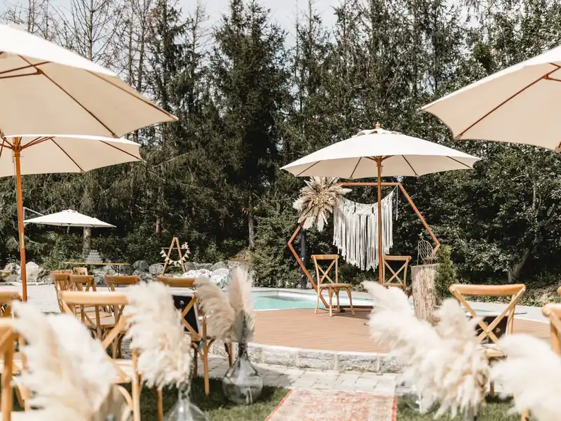 Der Außenbereich mit eigenem Pool ist ein echtes Alleinstellungsmerkmal. Ideal für Sektempfang, freie Trauung oder Hochzeitsfotos im Grünen.